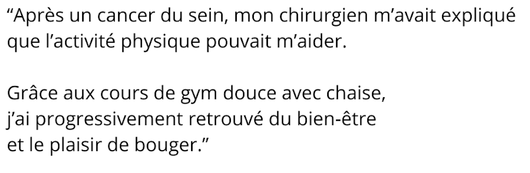 L’ESPACE GYM AVEC CHAISE s’adresse aux personnes de 60 ans et plus qui souhaitent prendre soin de tout leur corps en douceur, sans se faire mal et sans se mettre en difficulté.